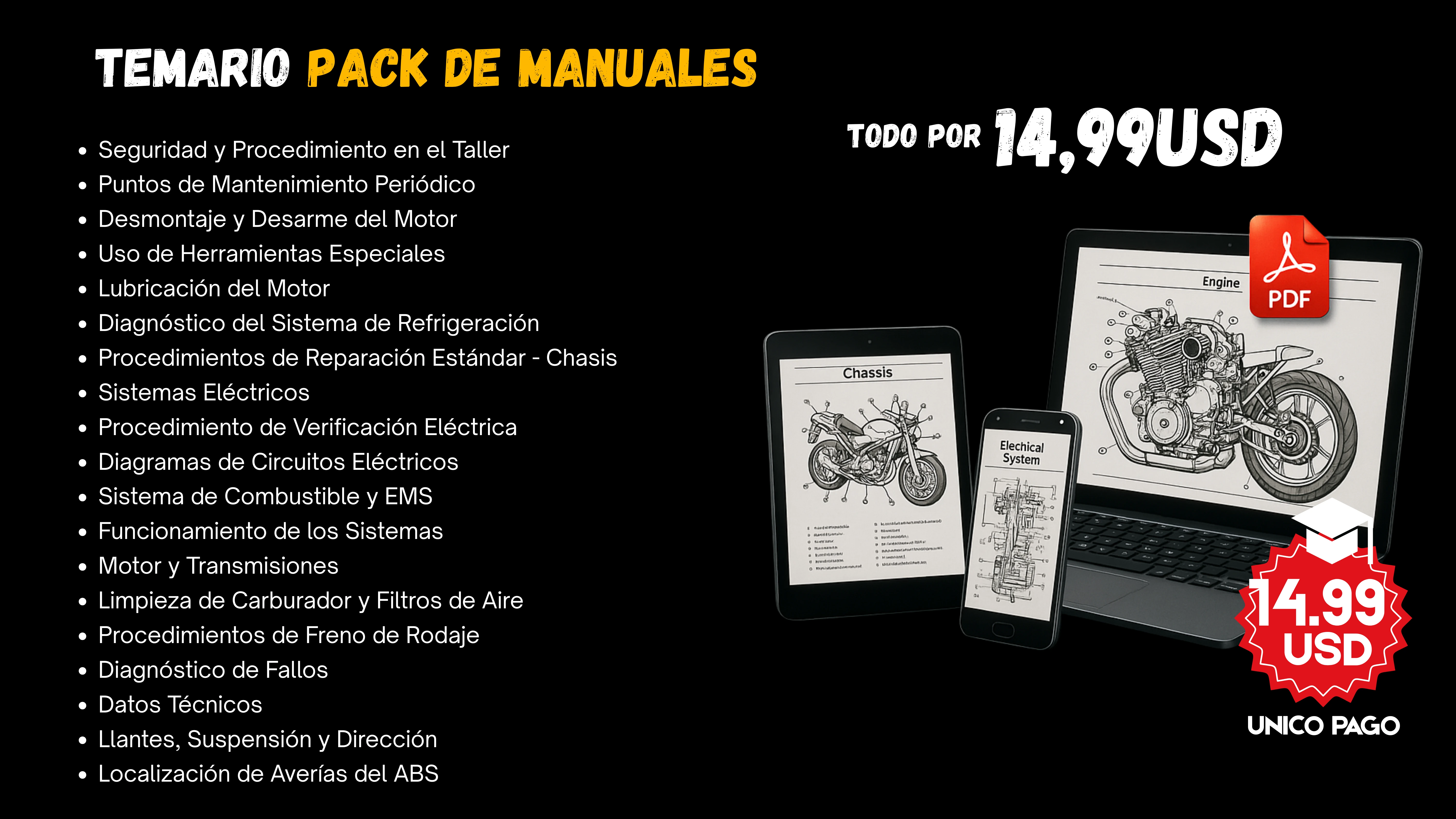 El contenido principal son archivos PDF de alta calidad, que representan los manuales de taller, despiece y servicio. Además, el producto incluye una colección de MANUALES PRÁCTICOS para guiarte en las reparaciones más comunes, complementando la información técnica de los manuales.